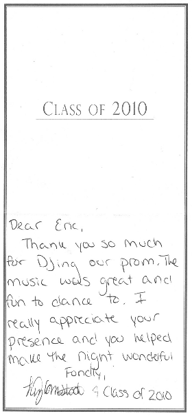 Comments: Eric really was amazingg. he was at the venue before i even was! the music truely made the party and i dont know how it would have gone so great without him. my friends came up to me after ragingg about the music and eric. i plan on trying to book him for our future proms, if i can !!!! :) THANK YOU SOOOO MUCH!!!