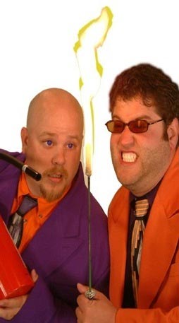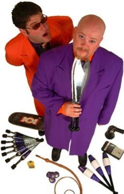 An outrageously good time awaits you at the next Fly by Night show! American comedians Stephen King and Ryan Dekoe of Boston, Massachusetts have been performing their on-the-edge brand of Dangerous Comedy since 1990. This odd and hilarious duo combine a bizarre mix of stand up comedy, juggling, sideshow antics, and "other various skills and proficiencies," into one extremely popular and unforgettable show. Their show entitled JUGGLE THIS! has a classical vaudevillian style, coupled with the sarcastic temperament of modern stand up comedians. Snappy comedic dialog, quick-witted improvisation, audience participation, amazing technical skill not to mention excitement and danger, sets the pulse of the show. Fly by Night's high-energy performances and quirky sense of humor have been witnessed internationally by hundreds of thousands of people. Steve and Ryan of Fly by Night have a certain synergy that is hard to find in a comedic duo. Their professionalism and polish as artists, is a result of countless hours of training, performing, hard work, and a passion for entertaining. |